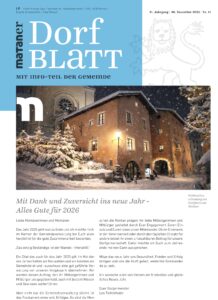Die neueste Ausgabe des Montaner Dorfblattes (Dezember 2025) ist ab sofort online. Diese Ausgabe umfasst 36 Seiten voll gefüllt mit Informationen und Mitteilungen der Vereine sowie Berichte über Montan. Viel Freude beim Lesen, wünscht die Redaktion des Montaner Dorfblattes.