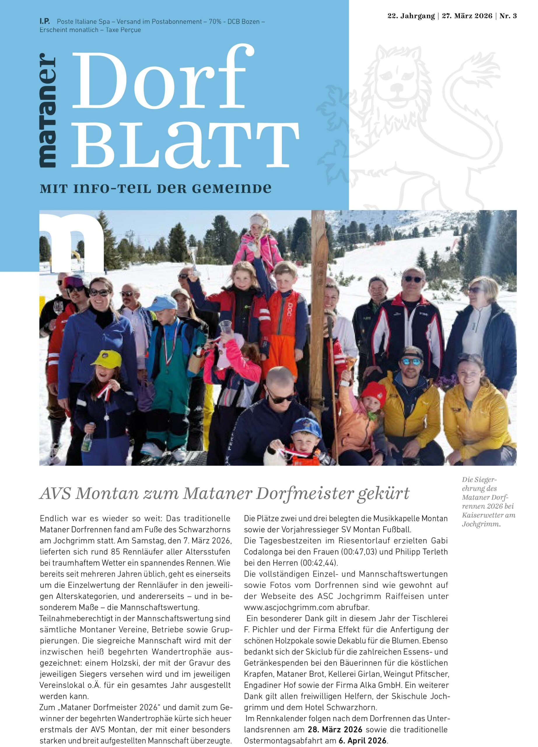 Die neueste Ausgabe des Montaner Dorfblattes (März 2026) ist ab sofort online. Diese Ausgabe umfasst 32 Seiten voll gefüllt mit Informationen und Mitteilungen der Vereine sowie Berichte über Montan. Viel Freude beim Lesen, wünscht die Redaktion des Montaner Dorfblattes.